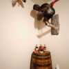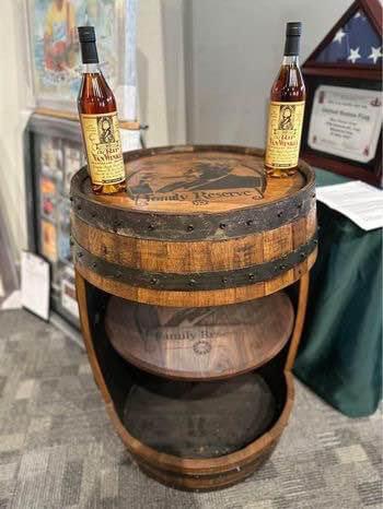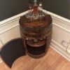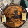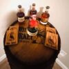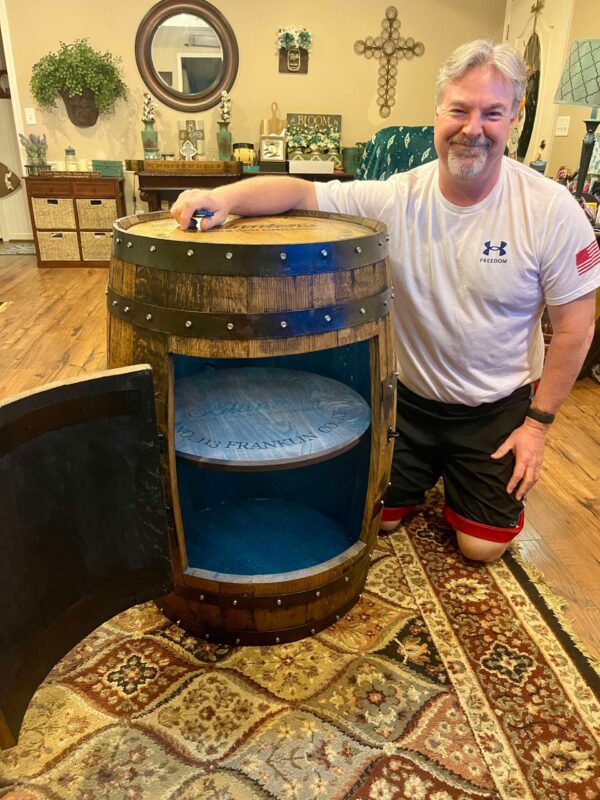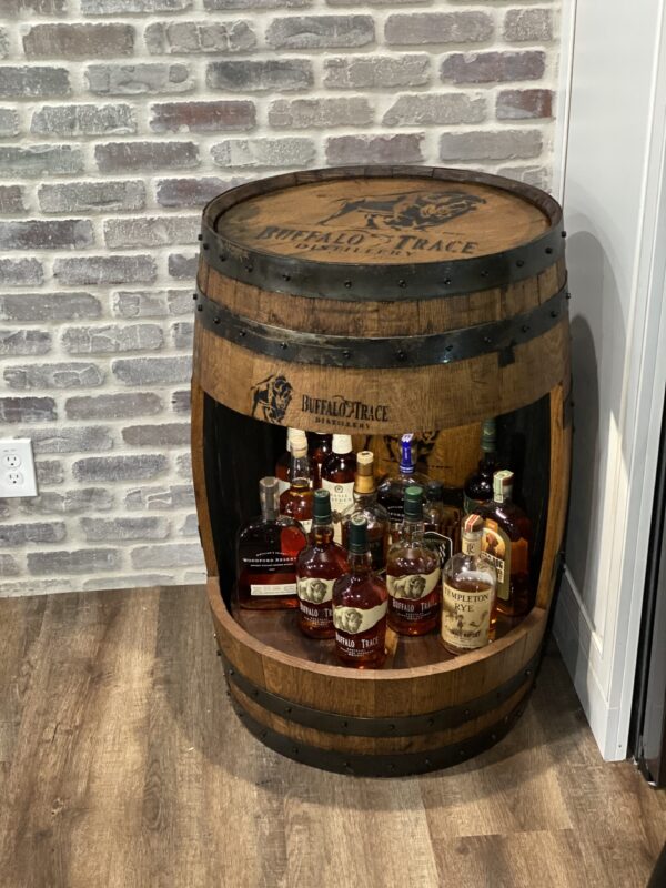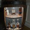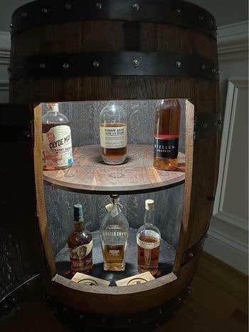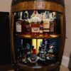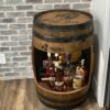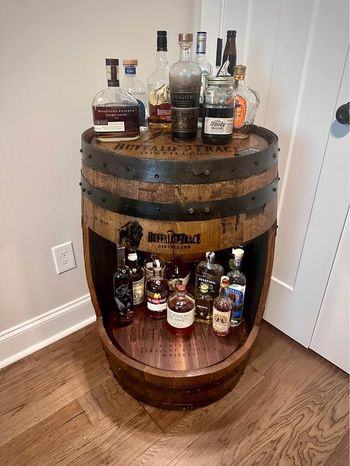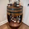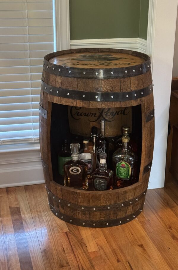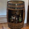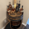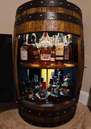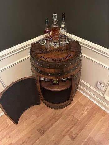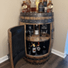 This are are authentic used whiskey barrels that we turn into gorgeous display pieces for your bar area, man cave, or sitting rooms. Theses bars come with a black walnut laser engrave shelf that we can customize to match the barrel or engrave from your personally recommendations. The bars can come in 2 options 1. with a door or 2. open display. The bars are approximately 35 in in height and at their widest 25 in in diameter. All bars come with LED battery remote control lights. These lights have a multitude of colors and settings to improve your experience. The barrels are stained and sealed with a polyurethane to protect them and provide an extra furniture finish to them.