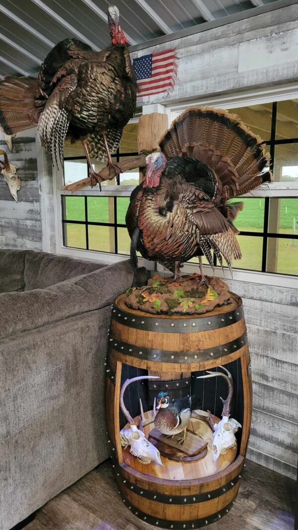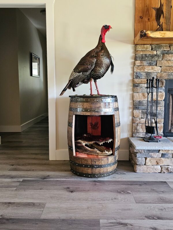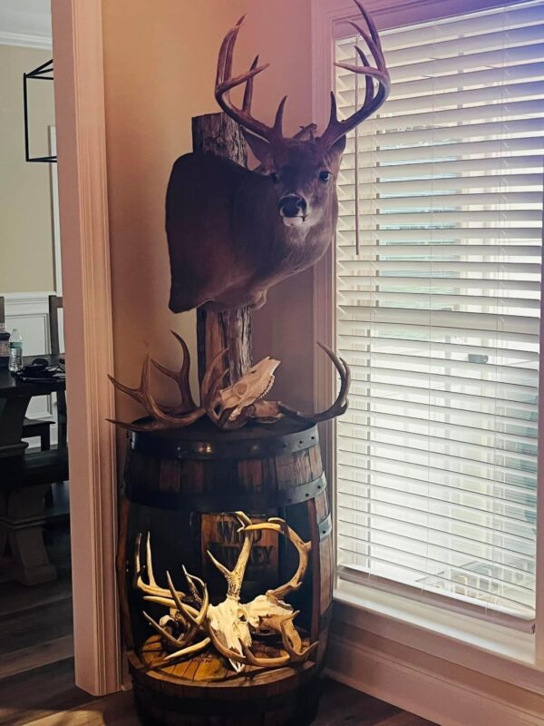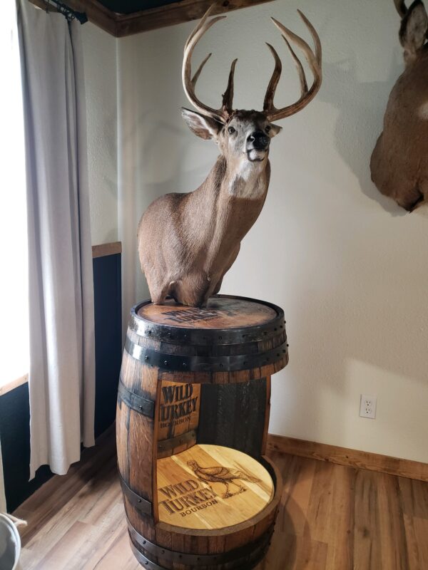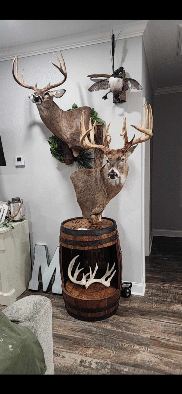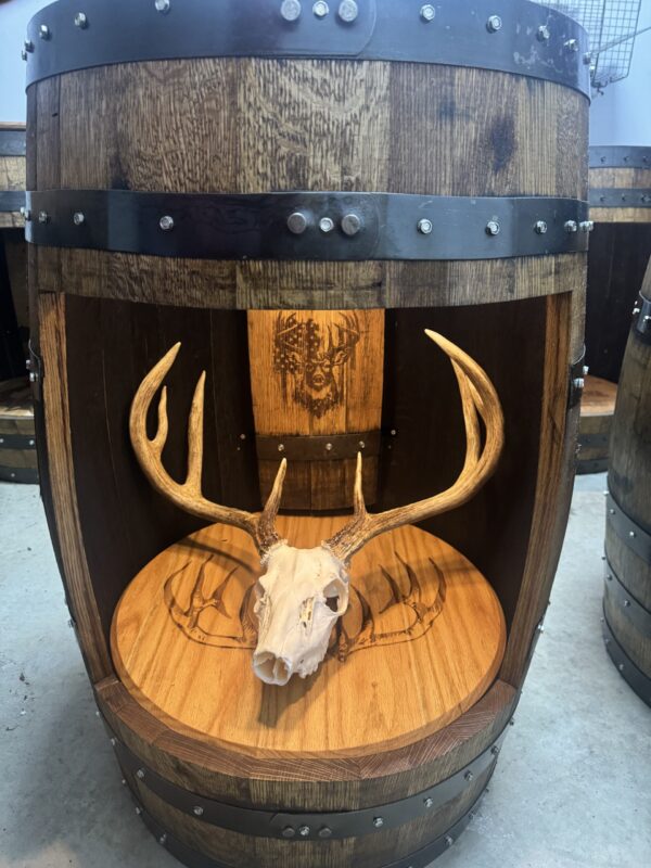 These are authentic used whiskey barrels that enable you to turn your Hunting Trophies into professional displays. These barrels come with a engraved bottom hickory shelf and a barrel plaque mounted to the back that match the brand. There is also the ability to customize unbranded barrels with a pdf emailed to use or to select from our current designs. These open barrels come with LED battery remote operated lights to add to your experience. These lights have a multitude of colors and settings.