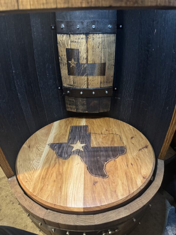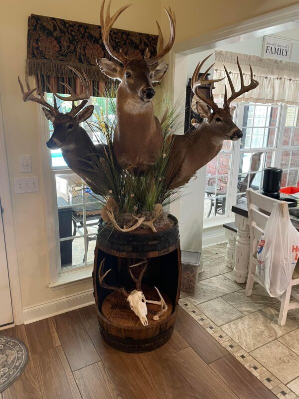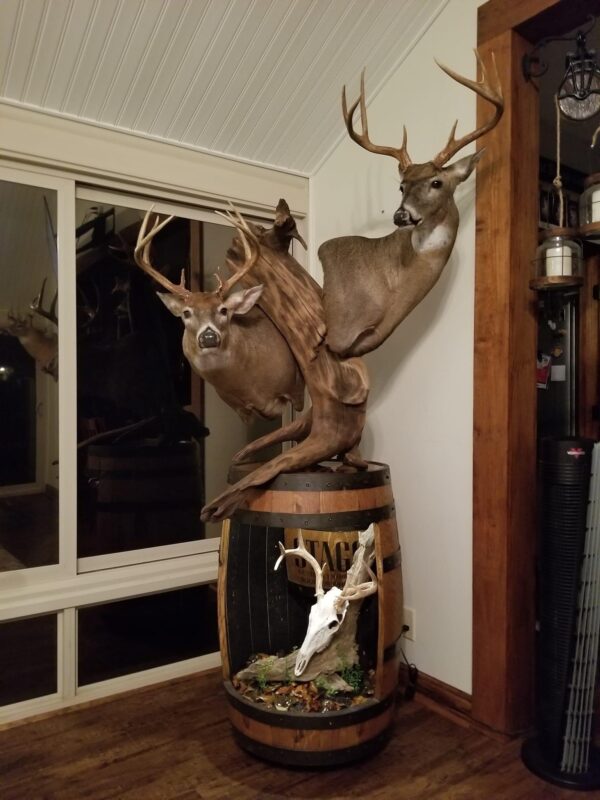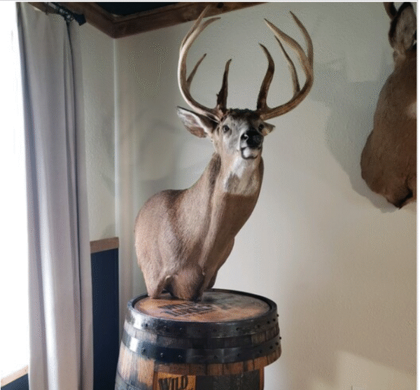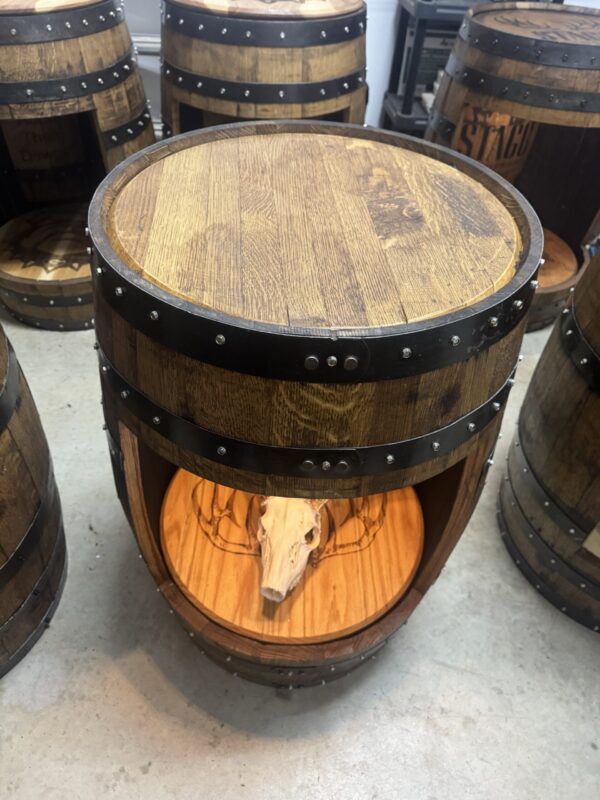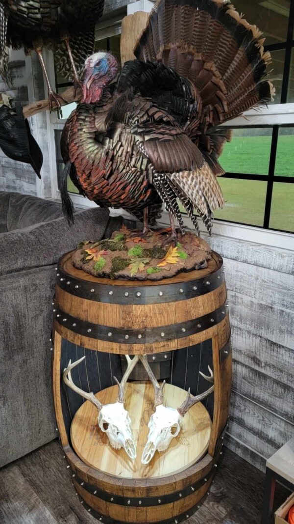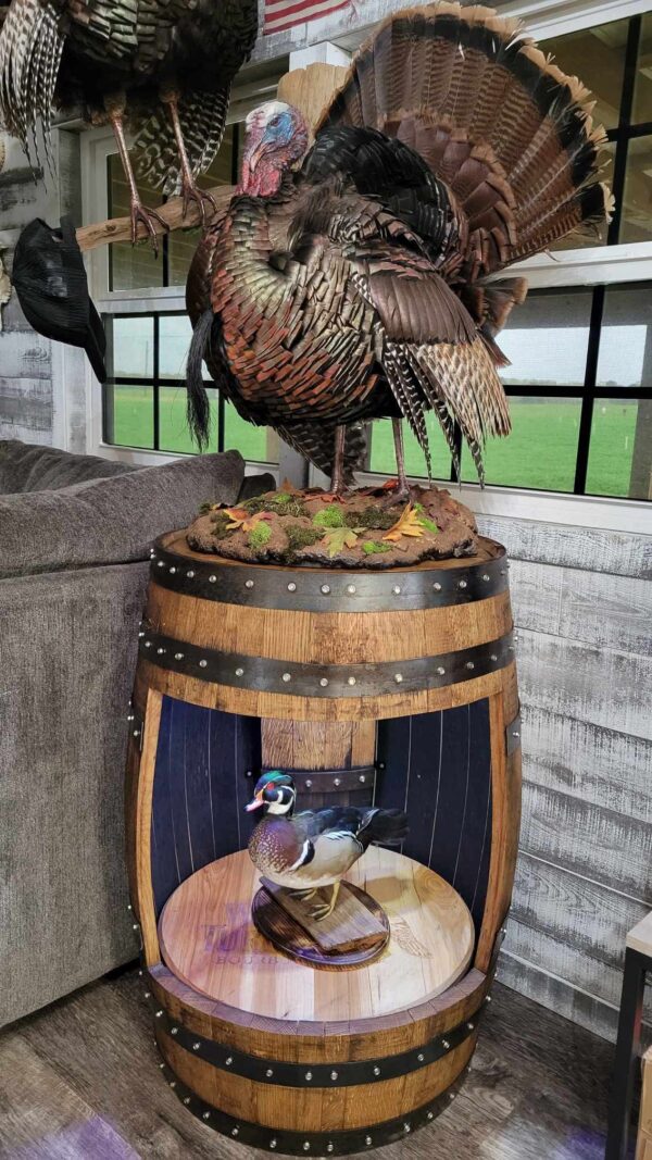 These are authentic used whiskey barrels that enable you to turn your Hunting Trophies into professional displays. These barrels come with a engraved bottom hickory shelf and a barrel plaque mounted to the back that match the brand. There is also the ability to customize unbranded barrels with a pdf emailed to use or to select from our current designs. These open barrels come with LED battery remote operated lights to add to your experience. These lights have a multitude of colors and settings.